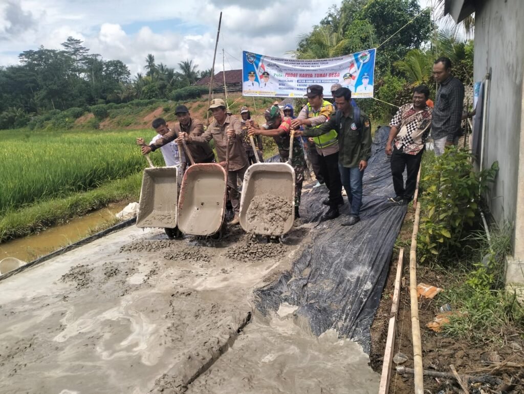 Pengecoran jalan rabat beton permukiman ini dilakukan sebagai upaya meningkatkan kualitas akses transportasi warga, khususnya di area persawahan dan pemukiman. Dalam prosesi simbolis tersebut, terlihat perangkat desa bersama aparat TNI (Babinsa) dan Polri (Bhabinkamtibmas) bahu-membahu menuangkan adukan semen menggunakan gerobak sorong sebagai tanda dimulainya pekerjaan.